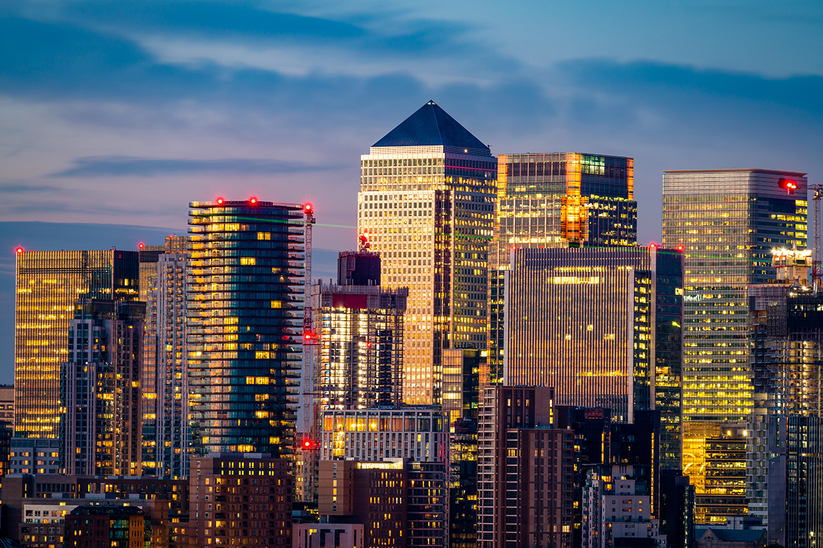 Canary Wharf at dusk seen from Greenwich Park